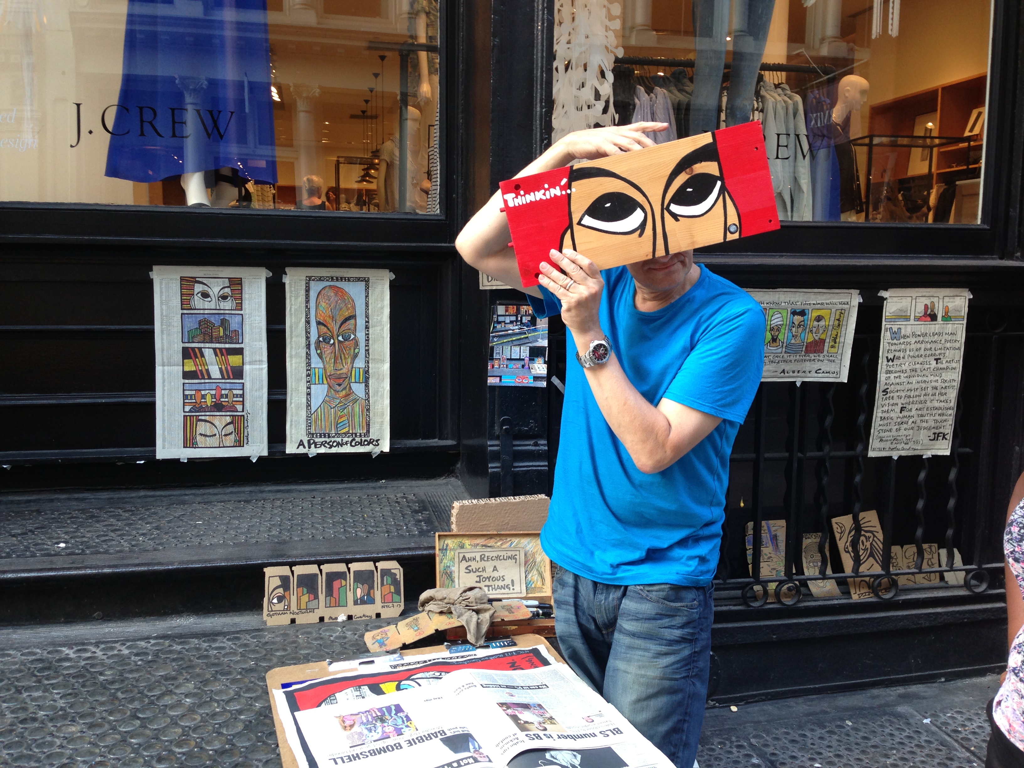I recently bumped into artist Matthew Courtney in Brooklyn, he was on his way to his usual spot in Soho, near to the Corner of Prince and Mercer St.  When I first met him, I was wandering through Soho with a friend and noticed him all set up on the ‘Steps to Nowhere Gallery’ as he called it.  He was making art while also entertaining passersby with his rhyming lyrics and generally positive jokes.  For sale were his pieces, mostly faces painted on newspaper, cardboard, wood and other found objects.  My friend and I were so intrigued by him, we each bought one of his pieces. We left him feeling invigorated by his beautifully positive approach to life and living.