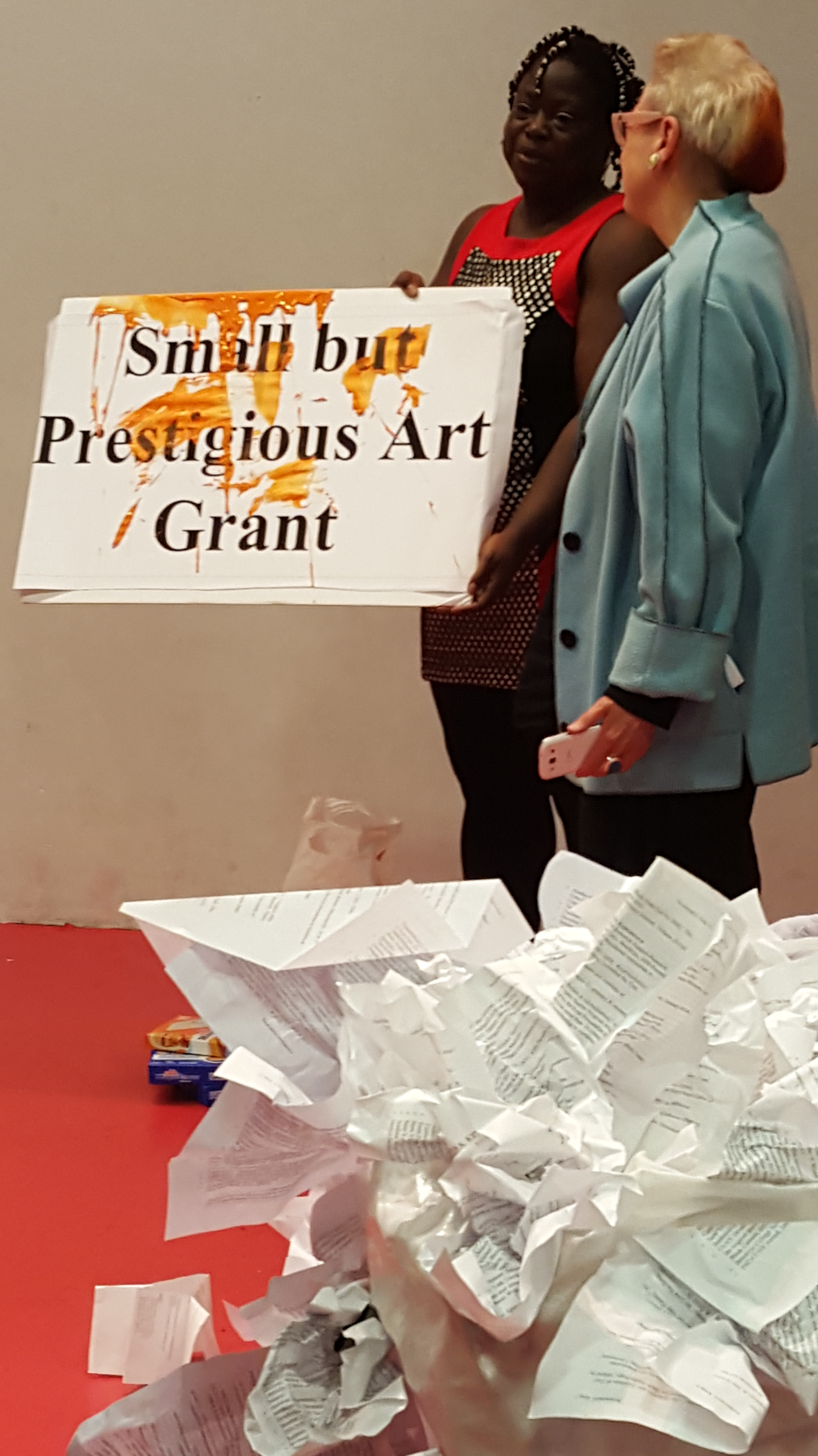 Picking from the large poster boards, that had words on them and were on each side of the stage, she weighed the meaning of specific terms and aspirations in her career and placed them in order of ‘importance’ on the large white wall in the back. It was a lecture performance on the written and unwritten rules of what artists and scholars need to have ‘on paper’ in order to be defined as successful. She talked about not having any training to be a teacher as an academic and yet demonstrated the essence of good teaching by making the story relatable to those of us in the audience. She even included audience members in the performance, by inviting a few to use gesture to demonstrate their careers. I was with her the whole way. My mind did not wander to who was next to me or in front of me or what I needed to do tomorrow, as often does happen while watching a performance. She kept me engaged in the ‘lesson.’