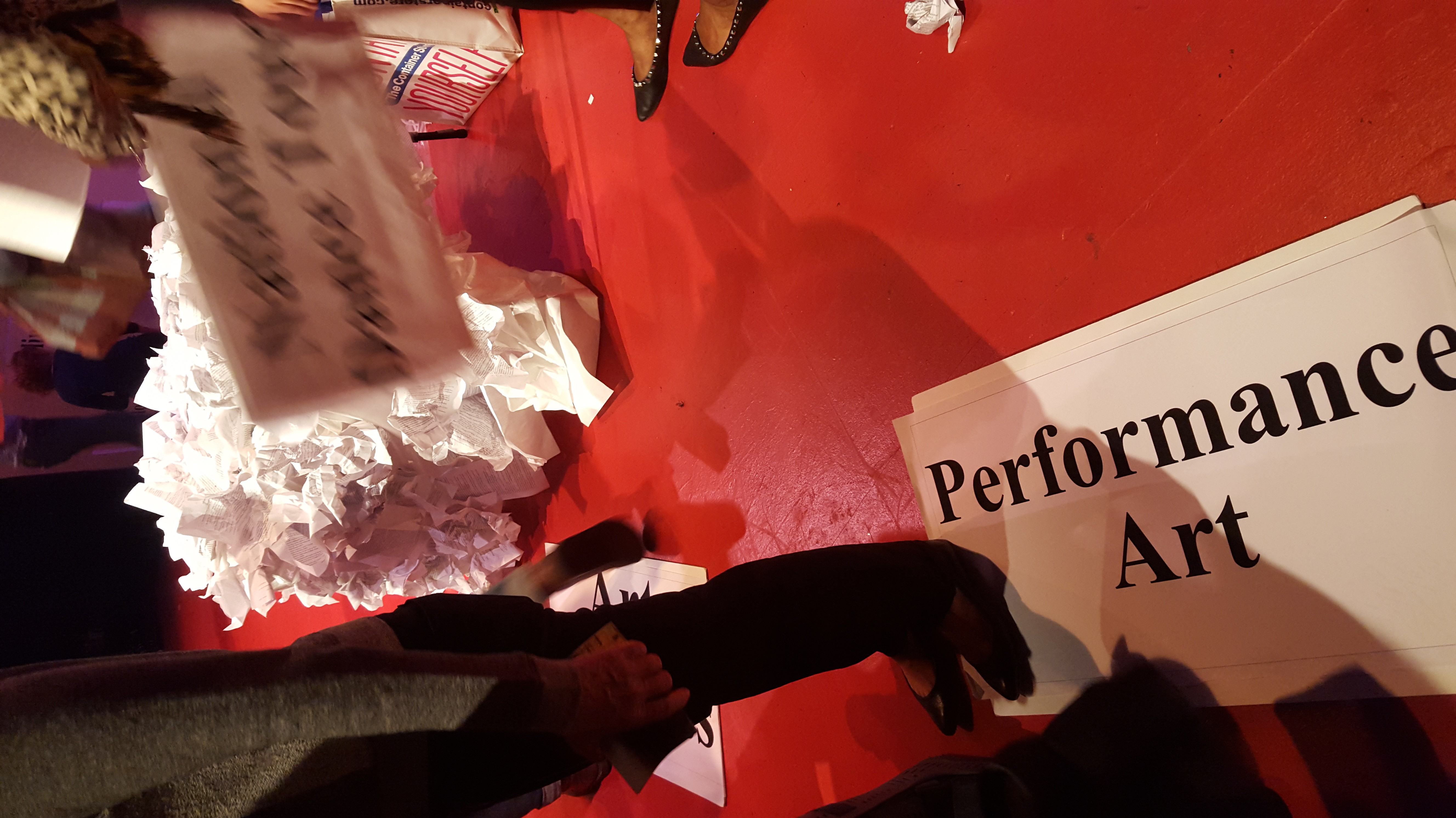 When Rosamond King entered the space with a pile of pages handing out sections of her curriculum vitae to the audience, I knew we were in for a ride. She wore an all-white, ‘paperesque’ jump suit and entered a space that had a desk covered with paper at an angle on stage left and several large poster boards leaning vertically against each side of the stage. Though the stage had a pristine white surface there was paper everywhere.
